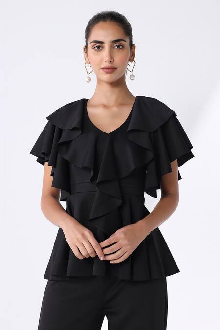 Black Lycra Solid V Neck Ruffle Sleeved Top And Pant Set