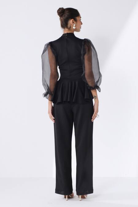 Black halter neck top featuring sheer organza sleeves and cut-out detailing. Paired with solid black pants for a complete look.