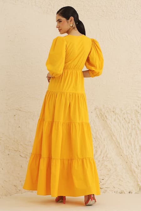 Yellow Cotton V-neck Solid Tiered Dress
