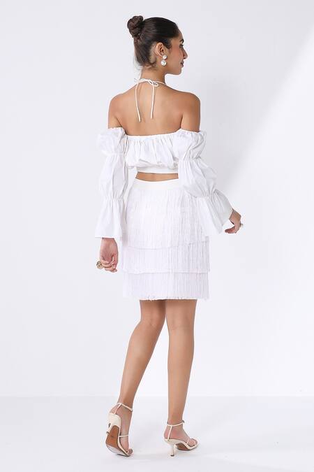 White crop top featuring a halter neckline and tiered sleeves. Paired with a fringed skirt made from banana crepe.