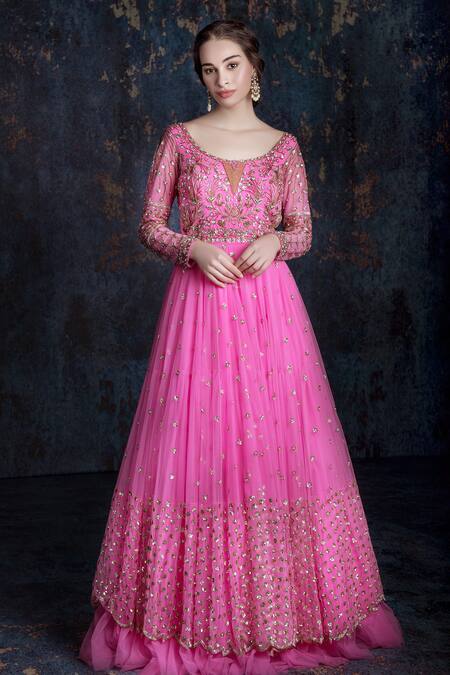 Bright pink anarkali gown with floral embroidered motifs & cutwork detail.