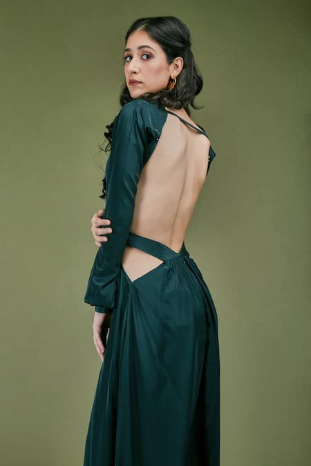 Emerald green long hem gown in satin base featuring knife pleats, side to back cut-out & attached strap.