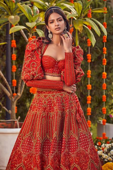 Rust raw silk floral embroidered puff sleeve jacket. Paired with embroidered lehenga and choli.