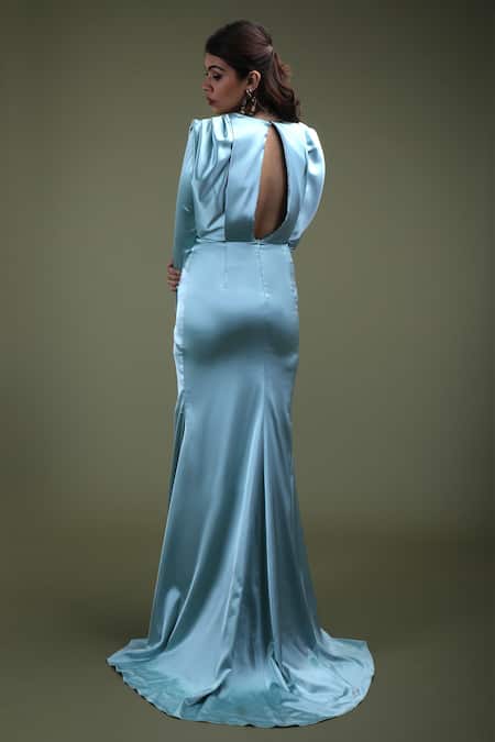 Blue gown in satin base fabric featuring draped yoke, fit & flare trail with soft gathers, back cut-out & thigh-high slit.