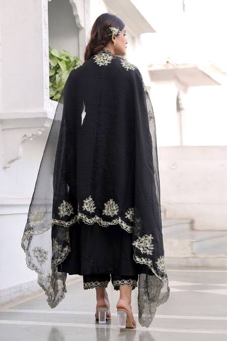 Black muslin anarkali featuring a notched round neck and three quarter sleeves. Paired with a pant and a floral scalloped cut work dupatta with contrast aari hand embroidery.