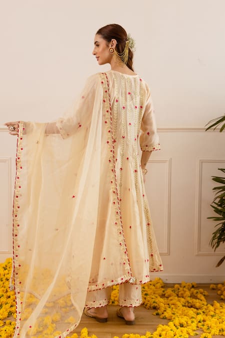 An ivory Chanderi Anarkali with uniform zari work and pink-flower aari sprigs. It is paired with a matching Chanderi pant and an organza dupatta that features similar pink aari florals and zari-lined borders. The set includes a separate inner slip, and the Anarkali has pockets on both sides.