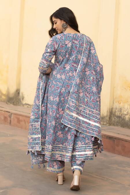 Blue Anarkali featuring a sweetheart neckline and three-fourth sleeves with an all-over gardenia handblock print. Paired with a matching printed pant and a dupatta with embellishments.