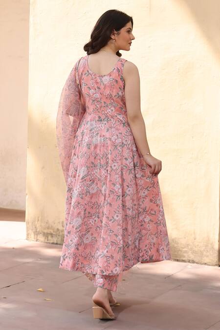 Peach Cotton Round Neck Jaali Printed Anarkali Suit Set