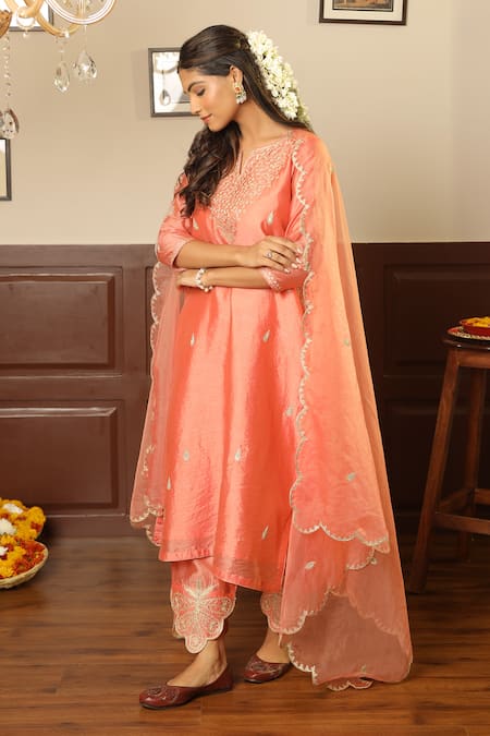 Peach kurta featuring placement zari embroidery on the front and pockets on both sides. Paired with matching pants that have an embroidered scalloped hem and an embroidered dupatta with a scalloped border.