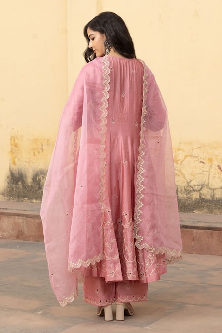 Pink Organza, Chanderi Zari, Embroidery Round Neck Gullista Jaal Anarkali Set