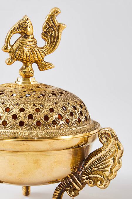 Gold incense loban bowl features a peacock design and emits fumes from its holes on the lid