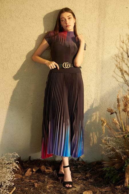 Multi Color Pleated Stripe Round High Neck Aster Accordian Top And Skirt Set
