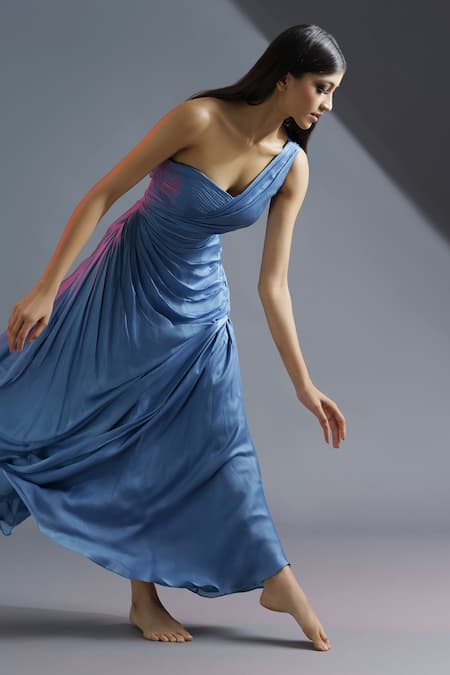 Blue satin georgette gown with pleated drapes, one shoulder panel & intricate pleated bodice.