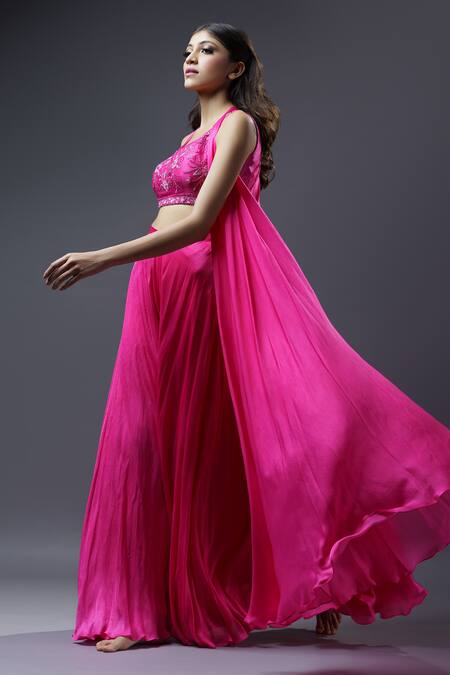 Fuchsia pink satin georgette flared palazzo pants. Paired with embroidered top with sequin work & sleeveless long cape.
