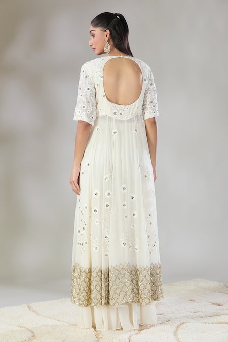 White jacket style front open kalidar kurta featuring tonal floral embroidery with cutdana and sequins. Paired with an embroidered dupatta and solid tiered sharara.