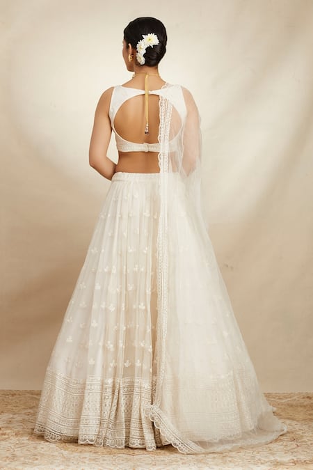 White attached can can lehenga with floral thread embroidery. Paired with padded blouse & scallop dupatta.