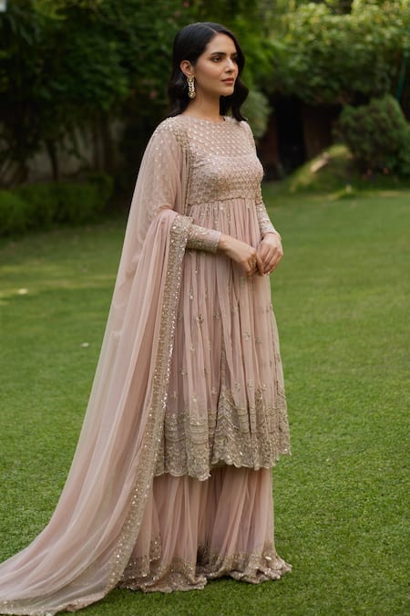 Pink net anarkali featuring floral embroidery with sequins and scallop hem detailing. Paired with coordinating embroidered sharara and dupatta.