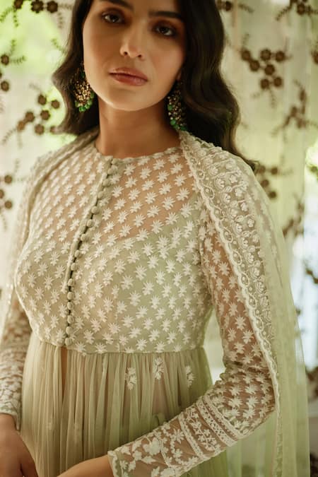 Sage green floral embroidered jacket featuring thread and sequins work with a scallop hem and potli buttons. Paired with a coordinating embroidered sharara and dupatta.