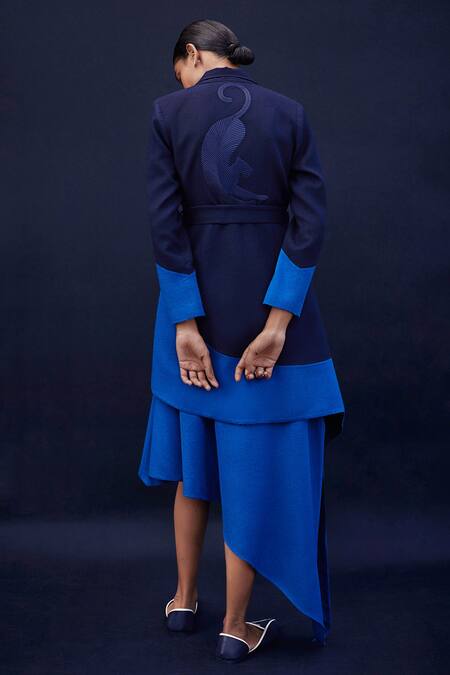 Navy blue wool asymmetric jacket with monochrome panels, placement leopard pattern cord work & notched lapel collar. Paired with belt.