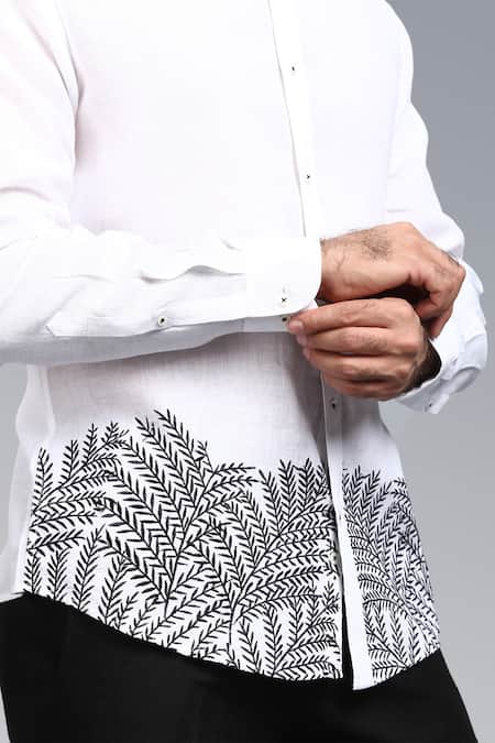 White shirt featuring leaf detail hand embroidery with French knots and kaantha embroidery