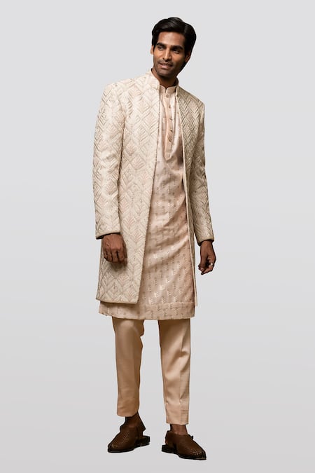 Beige achkan featuring intricate zari and kiran dori embroidery in geometric and floral patterns. Paired with a coordinating kurta and pyjama.