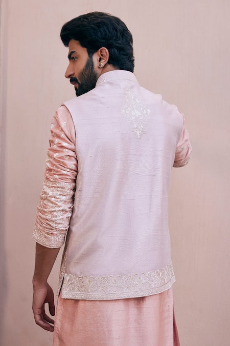 White bundi featuring thread embroidered floral motifs. Paired with a peach kurta and pant style pyjama.