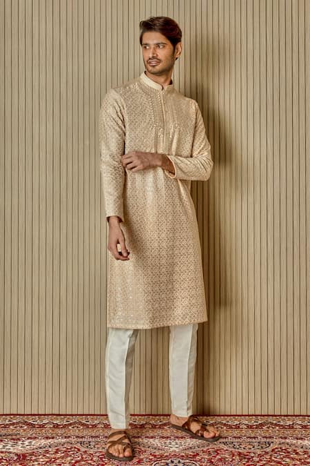 Beige kurta in tussar silk featuring tonal resham, lurex, zari, and sequin embroidery in floral jaal patterns. Paired with a matching pyjama.