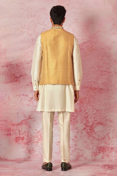 Yellow bundi featuring intricate kantha stitch embroidery with floral and bird motifs. Paired with a cream kurta and pyjama set.