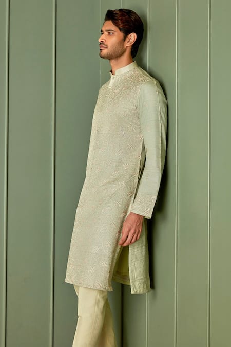 Olive green tussar silk kurta featuring all over floral jaal pattern with tonal resham embroidery. Paired with a contrast pyjama for a complete look.