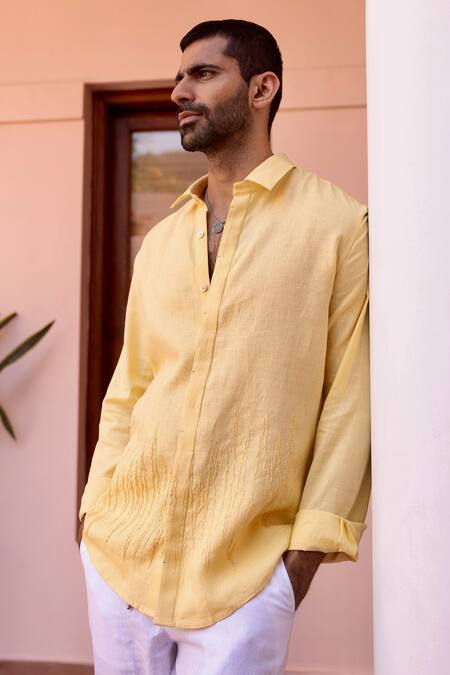 Pale yellow shirt made from pure linen featuring tonal stitchwork and dori embroidery