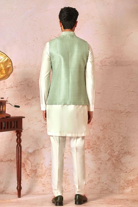 Mint green bundi featuring vintage jaal pattern with dori and lurex badla work. Paired with a cream full sleeve kurta and pant style pyjama.