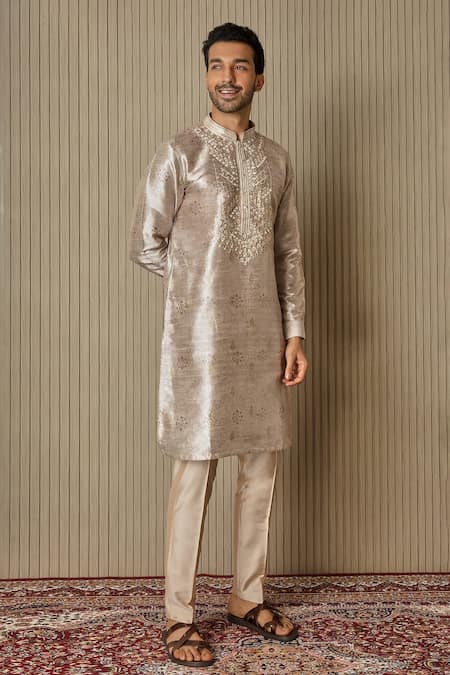 Brown jacquard silk kurta featuring Mughal print with mirror, sequin, resham & zari embroidery on the yoke. Paired with a contrast pyjama and includes embroidered collar and side slits on the kurta.