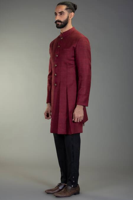 Maroon bandhgala with front knife pleated detail & front button placket detail.