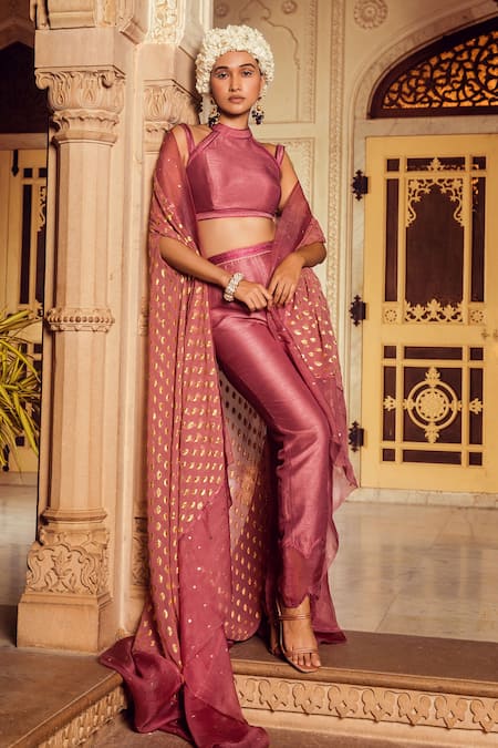 Mauve cape with buti embroidery and asymmetrical hem. Comes with halter blouse and straight pants.