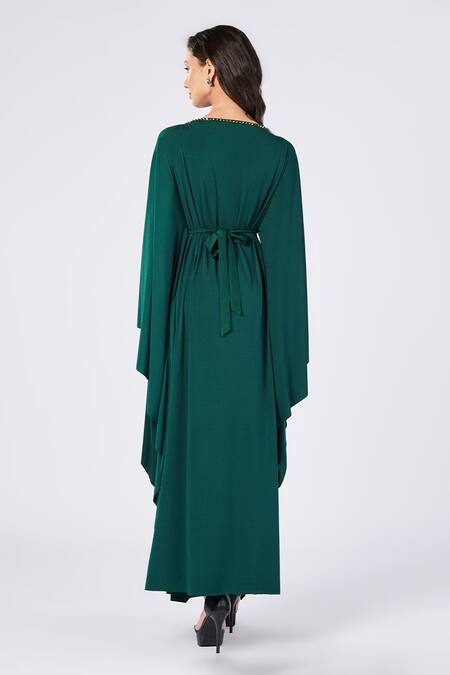 Emerald green asymmetric dress featuring metallic embellishments and cascading slit cape sleeves