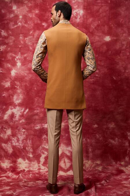 Mustard yellow asymmetric jacket with printed layered front. Comes with short kurta & pants.