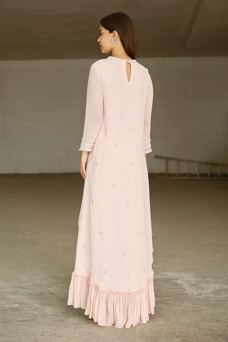 Pearl-stone embellishments on the kurta, Gathered frill flounce hem, Asymmetric hem design