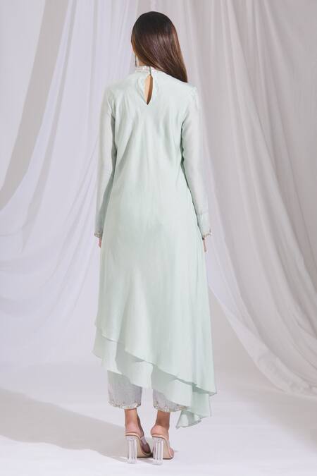 Powder blue layered kurta featuring an asymmetric hem and back keyhole. Paired with straight pants that complement the kurta's design.