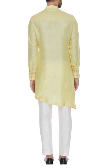 Yellow plain kurta made with asymmetric hem & buttoned placket.