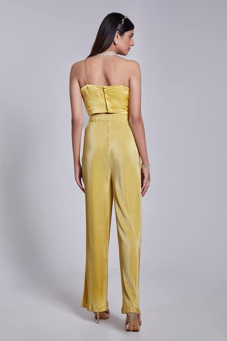 Yellow embroidered crop top featuring a sweetheart neckline, padded design, and pleated ruffle detail. Paired with straight pleated pants for a coordinated look.