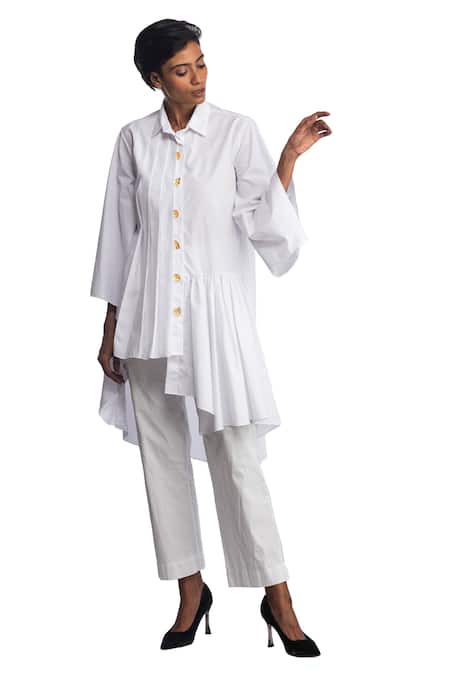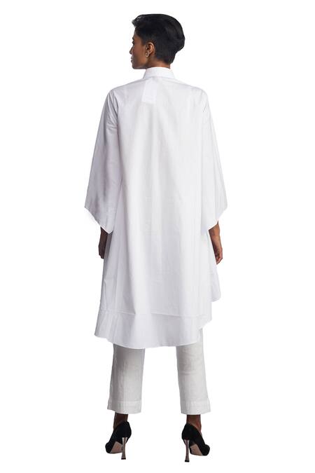 White Cotton 3d Applique Collared Neck Asymmetric Shirt