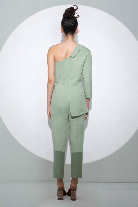 Buy_Pocketful Of Cherrie_Green Crepe One Shoulder Asymmetric Solid Jumpsuit_Online_at_Aza_Fashions