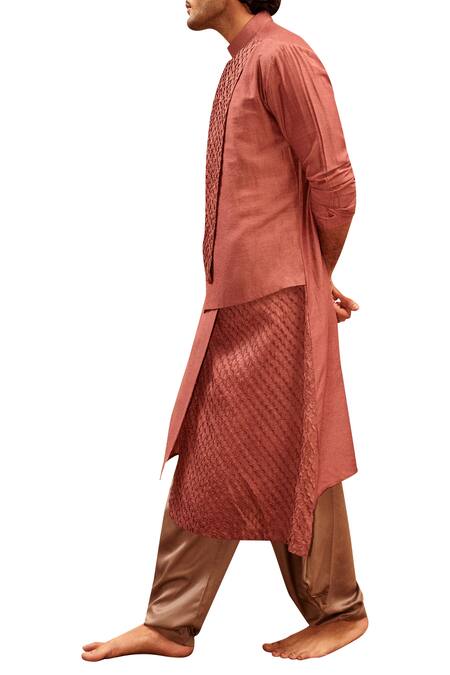 A rust tone asymmetric hem kurta enhanced with pintuck texture detailing. Coordinated with brown patiala-style pants and cut out from luxurious fabrics.