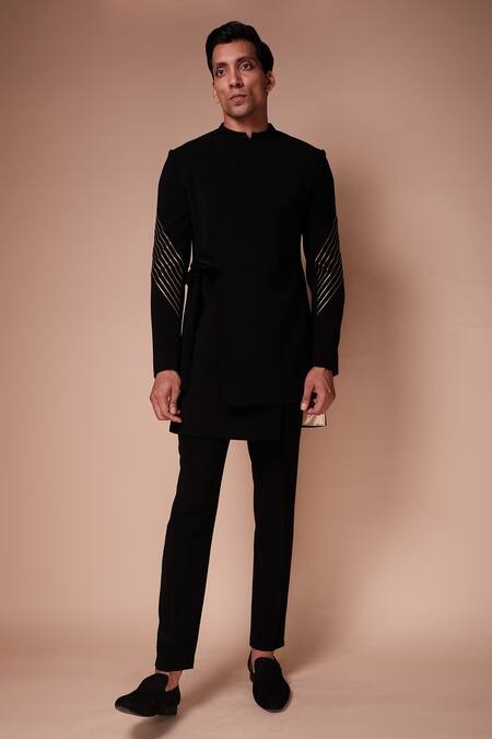 Black viscose polyester bandhgala with band collar, asymmetric overlap panel, side tie-up & sequin embroidered lines on sleeves. Paired with fitted pants.