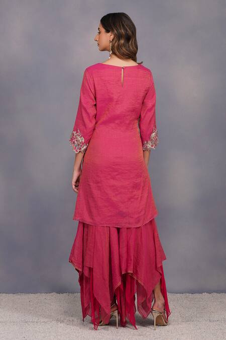 Embroidered cut-work sleeve hem >Side slit kurta with attached belt tie >Back closure with button keyhole >Asymmetric layered gharara >Elasticated gharara waist band