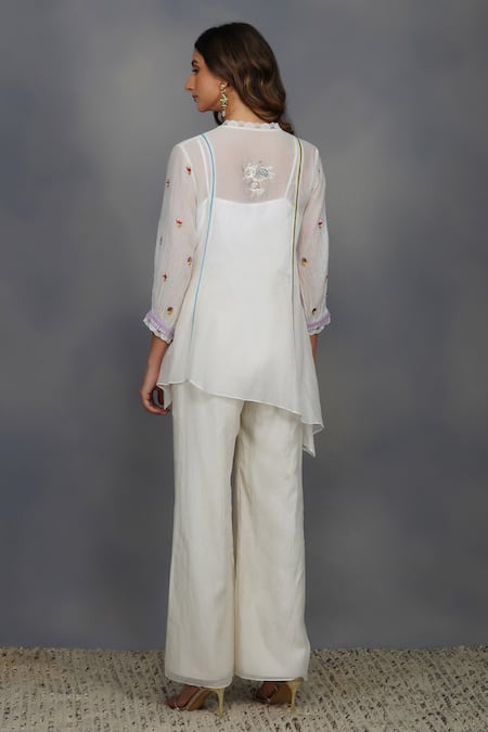 Ivory rustic style asymmetrical shirt, embelished in eclectic motifs. Paired with flared pants. Comes with an inner.
