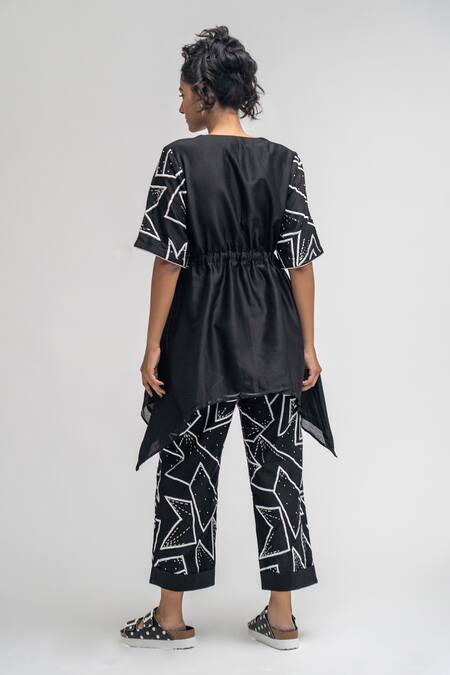 Black Chanderi Pearls, Beads V-neck Embroidered Placement Kaftan With Pant