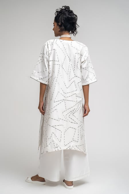 White chanderi asymmetric kurta featuring thread embroidered abstract patterns. Paired with matching palazzo pants.