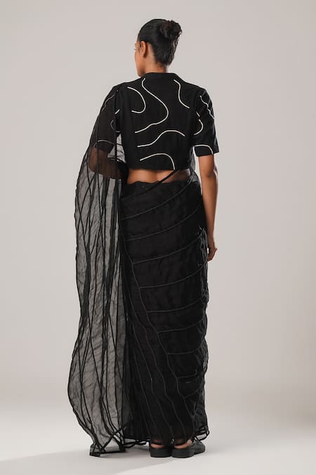Black saree crafted from silk organza featuring dori work in horizontal and vertical patterns