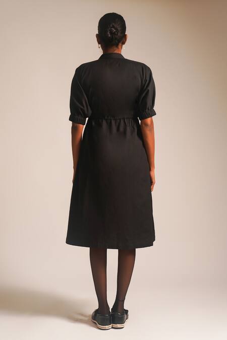 Black midi dress featuring a band collar and three-fourth sleeves, adorned with bead and dori work on the front